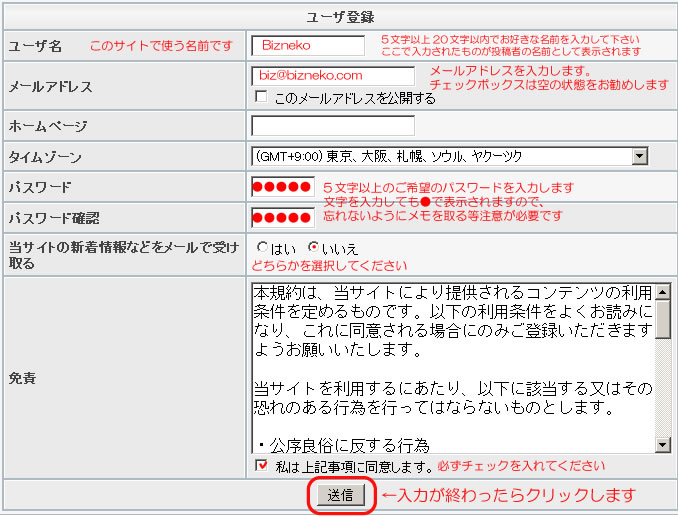 「ユーザ登録」の画面が現れますので下の画像を参考にして入力してください。