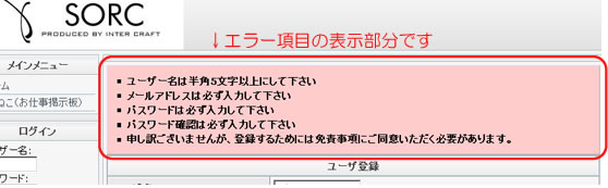 何か問題があった場合はユーザ登録欄の上にエラーメッセージが表示されます。