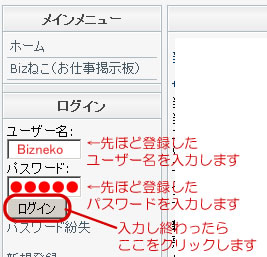「ログイン」メニューのユーザ名、パスワードにユーザ登録時と同じものを入力します。