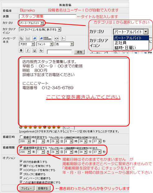 4.記入が終わりましたら文章を再度ご確認の上「プレビューボタン」か「投稿する」ボタンをクリックします。